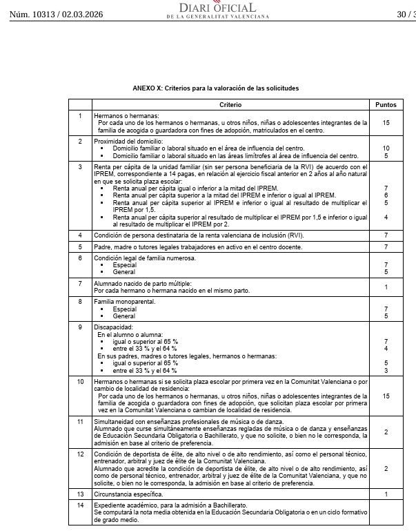 Criterios de baremación curso 2026-27