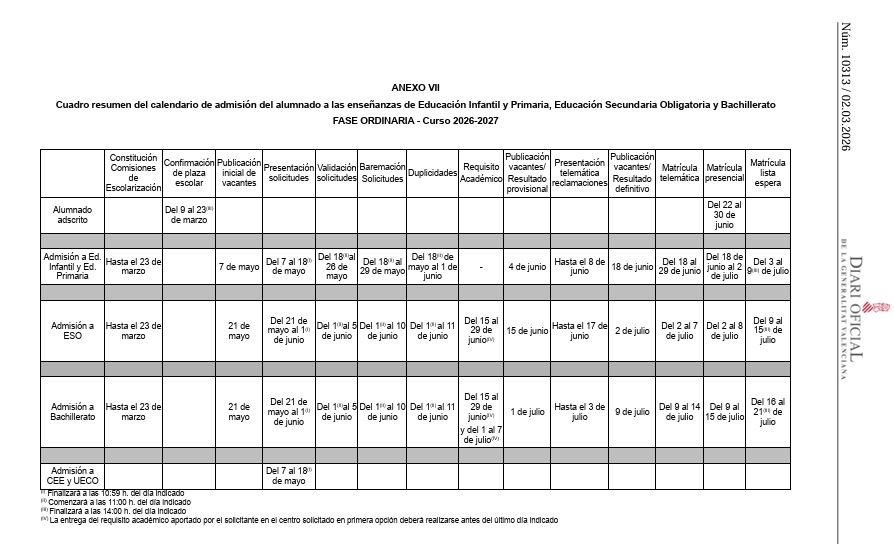 CALENDARIO DE ADMISIÓN curso 2026/27