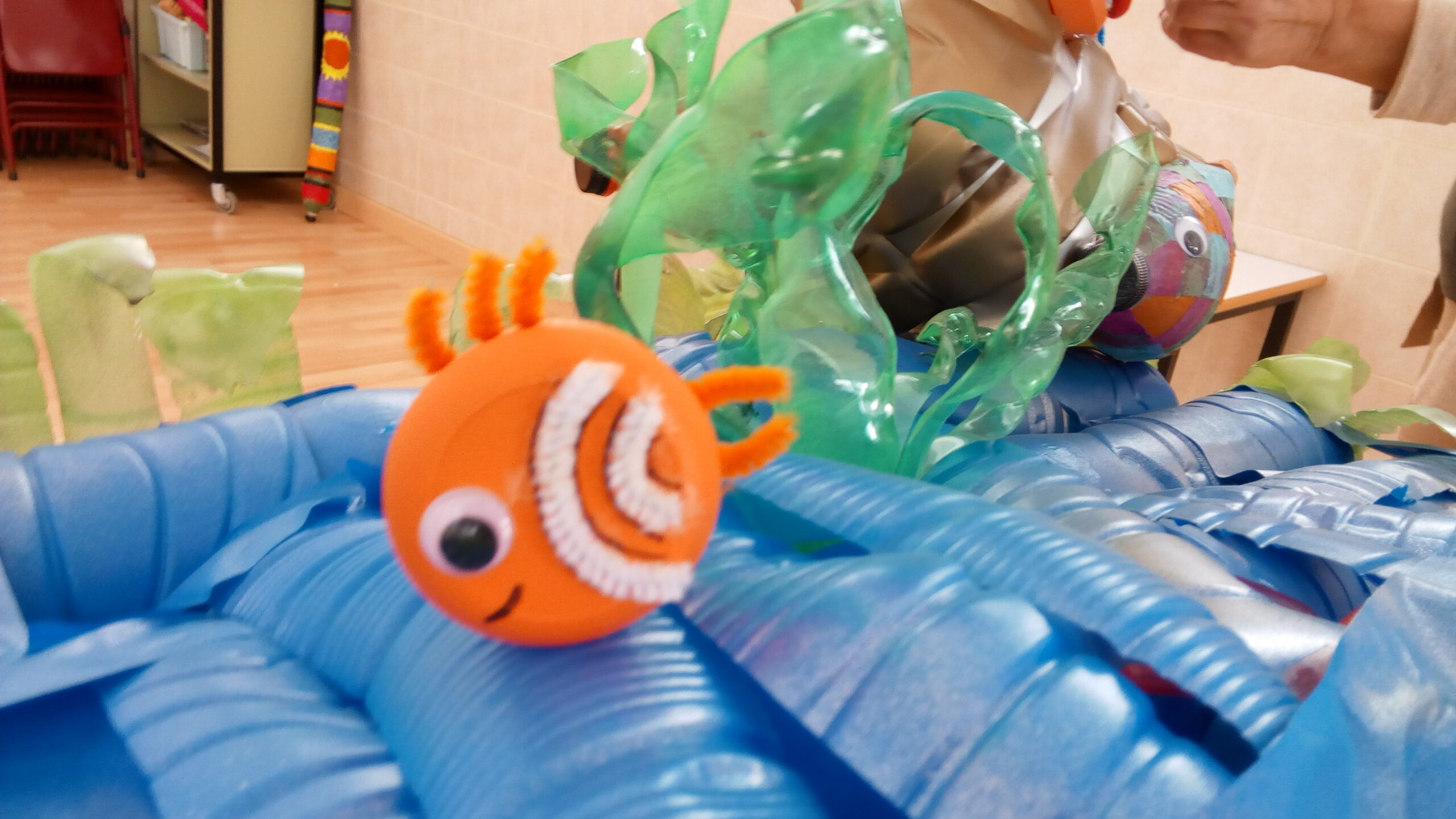 Se ha recreado un trozo de fondo marino, nombre que da título a la escultura, donde no falta detalle: cangrejos, estrellas de mar, peces de todo tamaño y color, anguila, nemos, algas,etc.